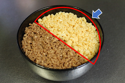 ご飯上面の残り半分の箇所に、炒り卵を左の写真のように敷き詰めましょう。 |