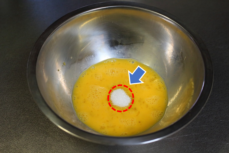 溶き卵に、砂糖(小さじ1+小さじ1/2)を入れ、これをよく混ぜましょう。 |