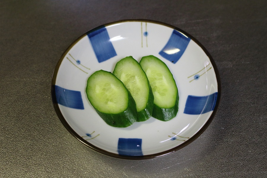きゅうりを3片斜めにカットし、左の写真のように用意しましょう。 |
