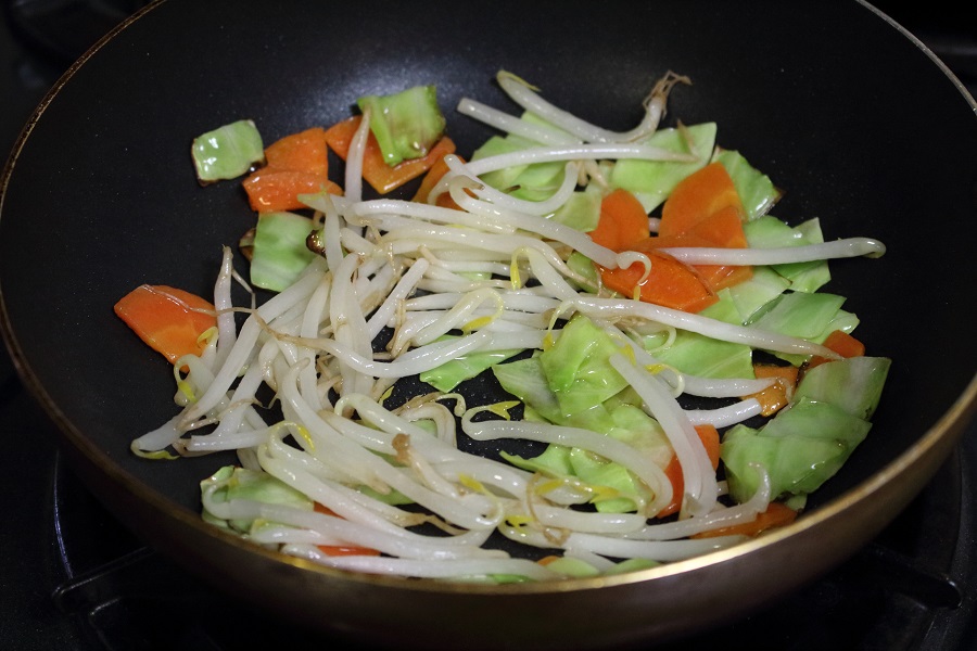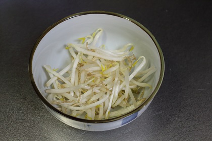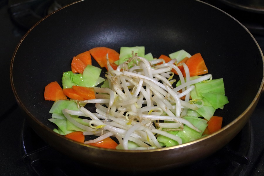 もやしを軽く(30秒程度)炒め、にんじん、キャベツと混ぜる。