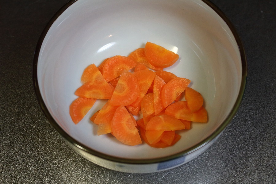 更にカットしたにんじんと水を皿に入れ、レンジで3分(500W)程度温め、柔らかくしておく。 |