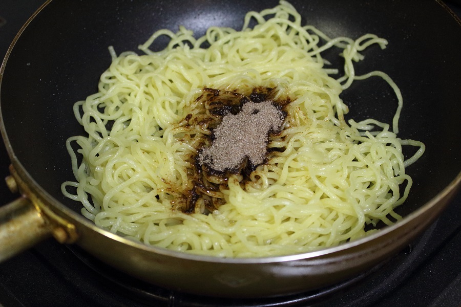 火を止め、焼きそば付属のソースをふりかけます。