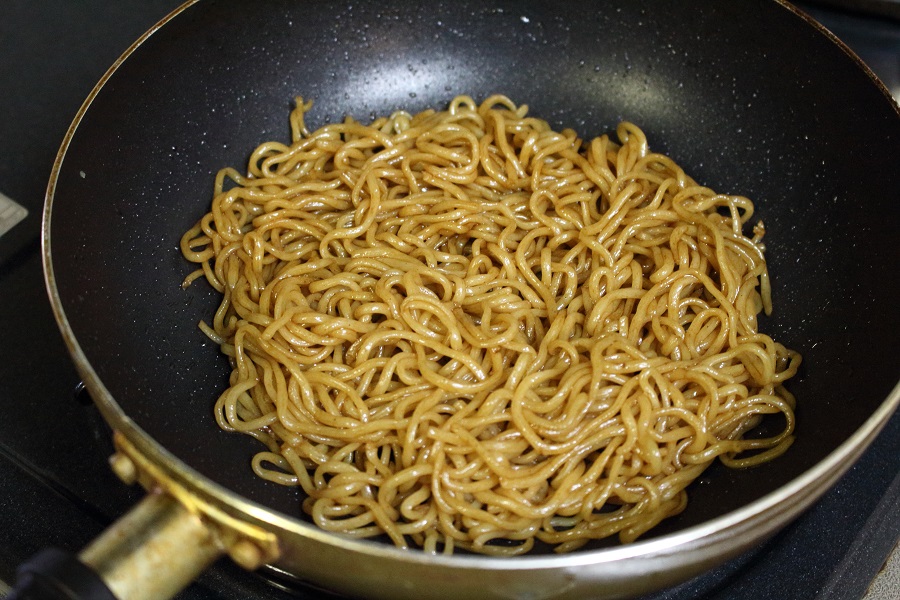 ほぐした麺に焼きそば付属のソースを入れます。 |