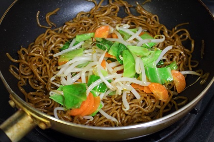 焼きそばの麺と炒めた野菜を混ぜましょう。 |