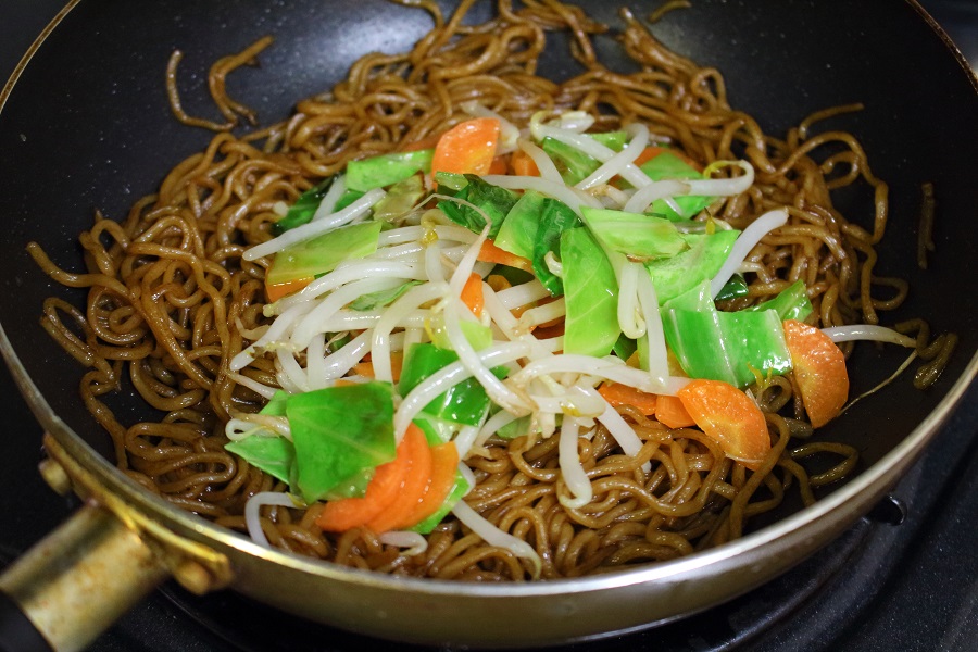 炒めた野菜と焼きそばを混ぜる。