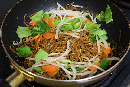 市販の焼きそば(付属ソース付き)を使って簡単に焼きそばを作りましょう。