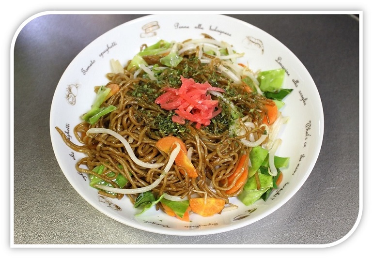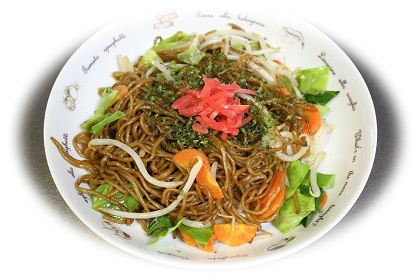 焼きそばの中央にあおさ粉と紅しょうがを盛り付けましょう。 |