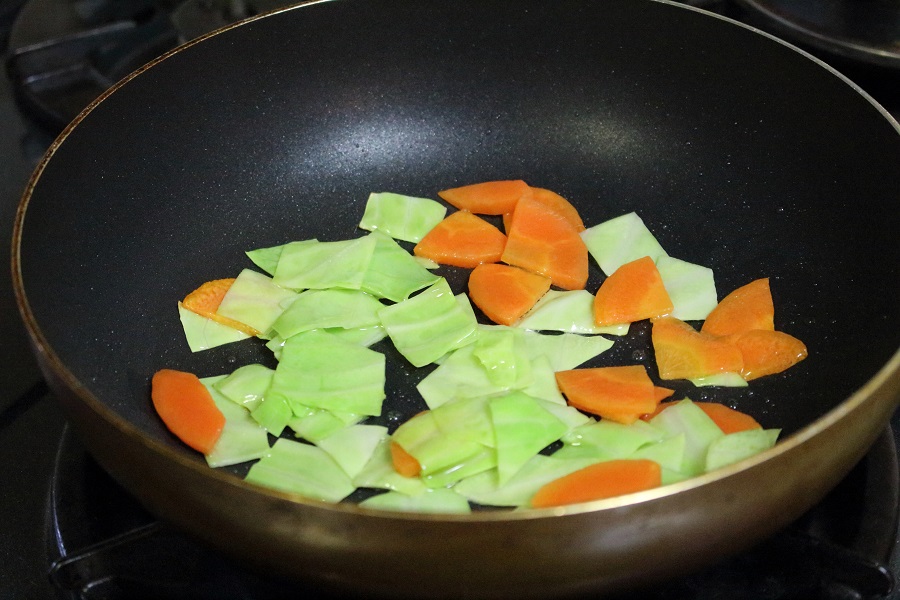 にんじんとキャベツを炒めている様子。この後、もやしも炒めていきます。 |