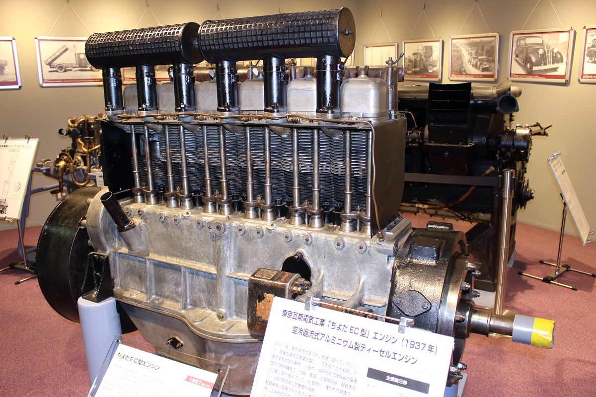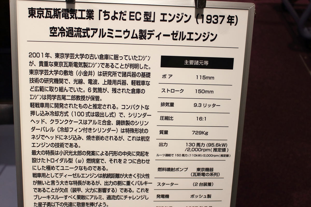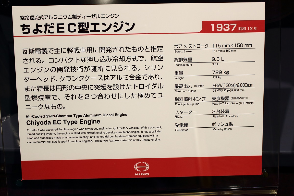日野オートプラザに展示されている「ちよだEC型エンジン」は東京学芸大学の古い倉庫から2001年に見つかったものですが、東京学芸大学の敷地(小金井市)には、かつて多摩陸軍技術研究所という軍の諸兵器に関する基礎技術の研究機関があったそうで、このエンジンは1945年に試作車が1輌だけ完成したと伝えられる五式軽戦車用のものである可能性があるようです。(ただし真偽についてはやはり不明です。)