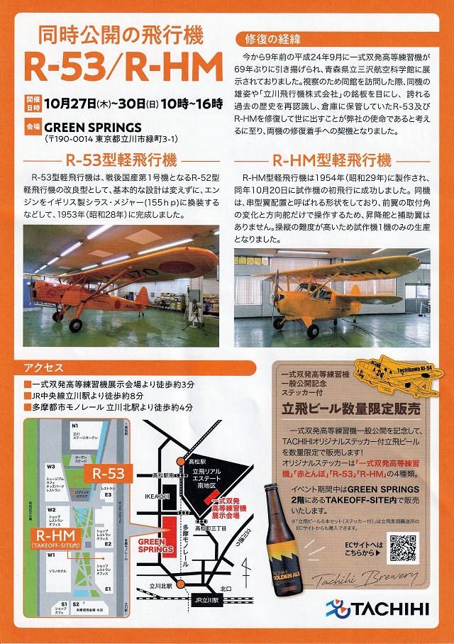また今回は前回の一般公開と異なり、立川飛行機が過去に製作し、その後「立飛ホールディングス」によって復元された「R-53」「R-HM」という2種類の軽飛行機も同時に公開されました。
