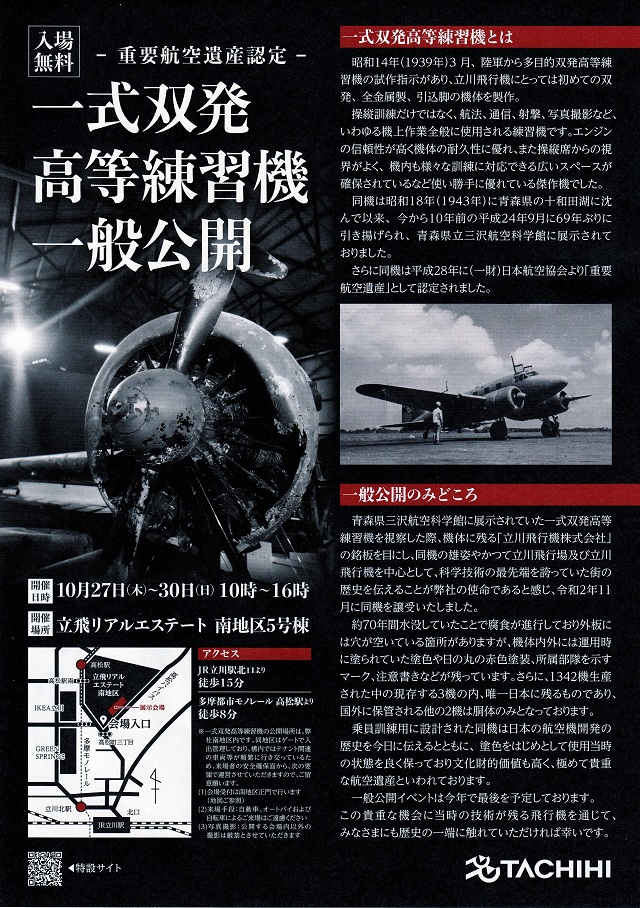 立川飛行機を前身とする「立飛ホールディングス」(東京都立川市)で旧陸軍の「一式双発高等練習機」の2回目となる一般公開(入場無料)が行われ、その見学に行ってきました。(2022年10月)