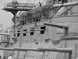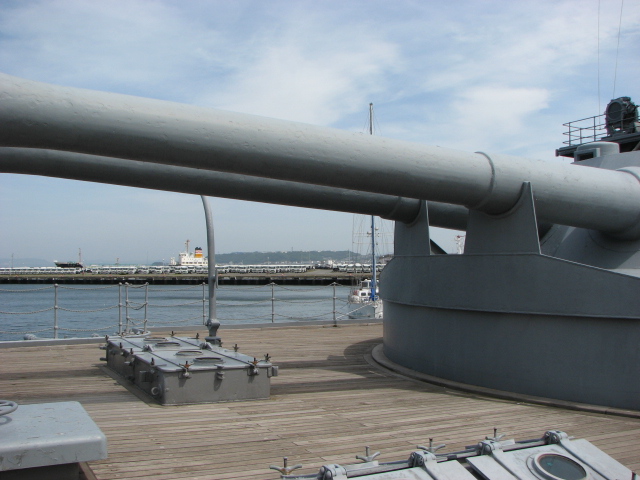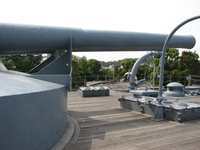 | 艦橋付近から前方を撮影。 主砲は40口径の30cm砲で太平洋戦争中の戦艦に比べれば小さいとはいえ、間近で見ると巨大そのものです。(ただし実物ではなくコンクリートによる復元です。) この30センチ砲のほかに、15センチ砲が14門、8センチ砲が20門、三笠に装備されていました。 |