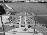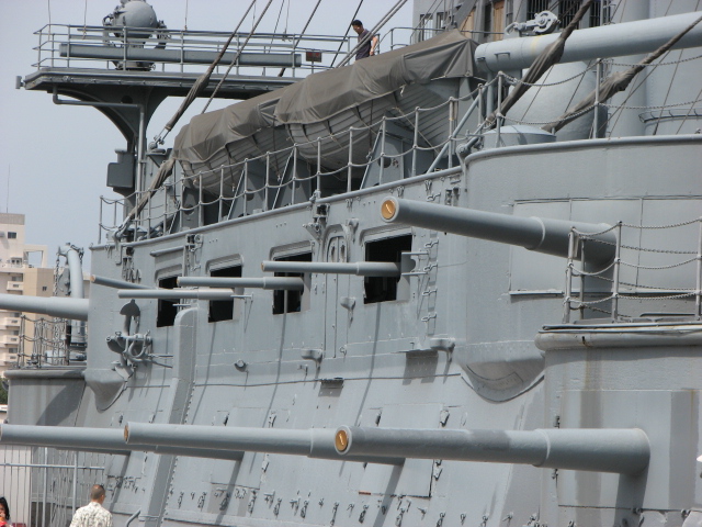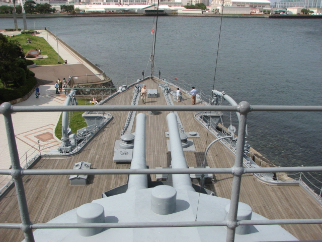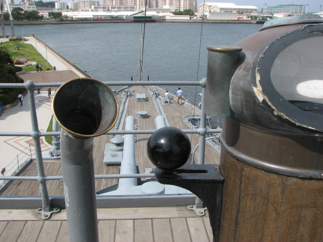| 三笠の艦橋で撮影した写真です。 日本海海戦のときには、東郷平八郎司令長官、加藤友三郎参謀長、伊地知彦次郎艦長、秋山真之参謀などが此の艦橋でロシアバルチック艦隊と対峙していました。(現在の三笠の艦橋には日本海海戦のときの様子を描いたレリーフなどが展示されています。) |
