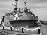 | 船体を全体的に撮影したものです。 全長が132mもあるのでさすがに大きいです。乗組員は860名だったそうです。 (その他、全幅は最大23m、排水量は15,140トンありました。) |