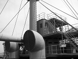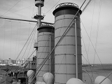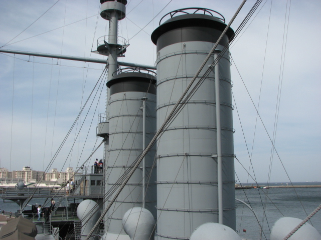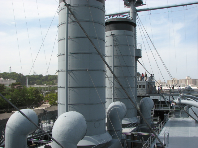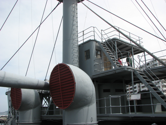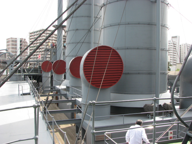 | 三笠の通風筒(赤)と煙突です。 三笠は明治時代の戦艦ですのでエンジンは石炭を燃料とする蒸気エンジンです。 (三笠のエンジンの軸馬力は15,000馬力で最大速力は18ノットでした。) |