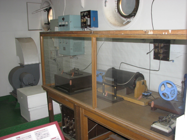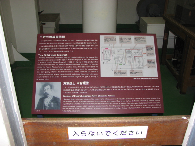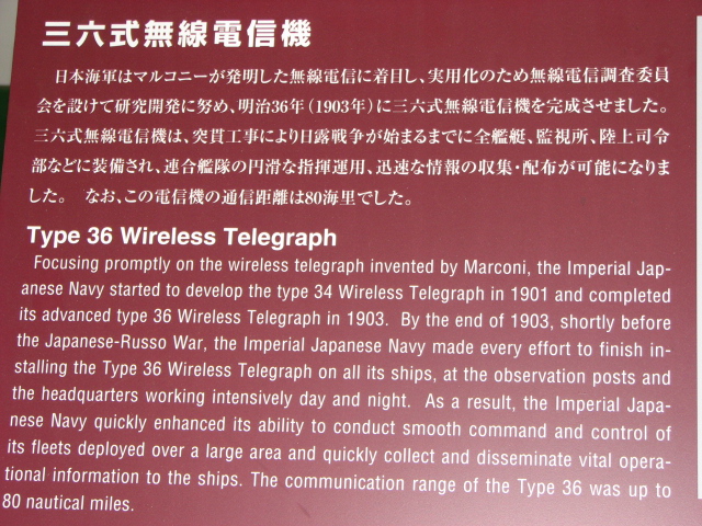 | 三笠艦内の無線電信室には「三六式無線電信機」(復元)が展示されています。 三六式無線電信機は海軍技師の木村駿吉(しゅんきち)が中心となって開発された優れた性能をもつ無線機であり、1903年(明治36年)に日本海軍に採用されました。公称通信距離は80海里(約150km)でこれを超える距離では更に無線機を中継して通信距離を伸ばしていました。 (日本海海戦におけるバルチック艦隊発見の第一報も仮装巡洋艦「信濃丸」からの電文が戦艦「厳島」を経由して連合艦隊の旗艦「三笠」に届きました。) 三六式無線電信機は採用後直ちに戦艦や巡洋艦など大型の艦艇に順次搭載され、日本海海戦までに仮装巡洋艦も含む駆逐艦以上の全艦艇に装備されました。 これにより日本海軍の艦隊は当時世界トップレベルの通信能力を持つことになり、迅速な情報の収集・発信、円滑な艦隊運用が可能となりました。 日本海海戦においては仮装巡洋艦「信濃丸」によるバルチック艦隊発見の第一報や、巡洋艦「和泉」による偵察報告(敵の位置、隻数、艦種、進路、速力など)などで三六式無線電信機は大いに活躍し、日露両艦隊が相まみえる戦闘の前に多くの有益な情報を連合艦隊にもたらしました。こういった事前の情報収集が日本を勝利に導く要因の一つとなったとも言えるでしょう。このように日本海海戦は、まさに「電波」というエレクトロニクス技術が活用された初めての海戦でもありました。 三六式無線電信機は当時世界最高レベルの性能を誇った無線機であり、国際的に見ても日本の科学技術発展の独自性を示すものでありました。その功績を称え、三笠の無線電信室に展示されている三六式無線電信機は2017年9月5日に国立科学博物館の定めた重要科学技術史資料(通称「未来技術遺産」) の第00228号に登録されています。 |