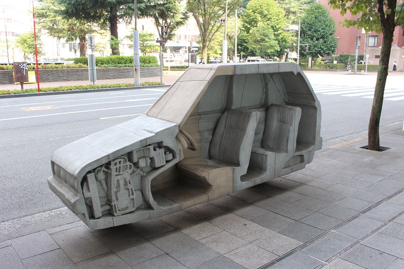 路上に不法駐車してある車を2つにばっさり切ったようなこの作品は車止めの機能を持ったベンチです。