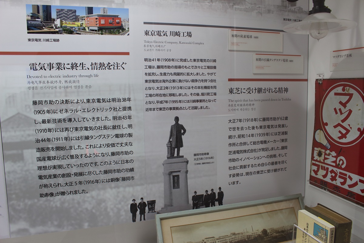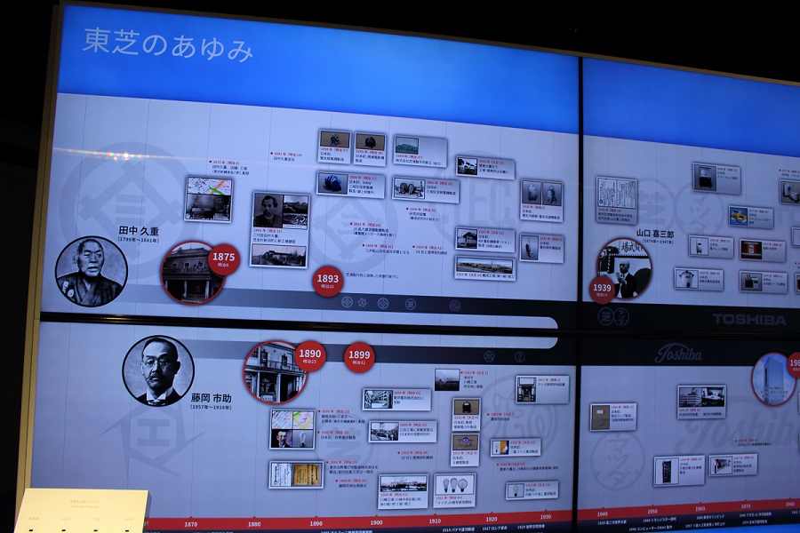 ヒストリーゾーンでは、芝浦製作所の創業者「田中久重」、東京電機の創業者「藤岡市助」の2人の生涯や、東芝の現在に至るまでの歩み、そして東芝がこれまで世に送り出してきた日本初、世界初の製品の数々を紹介しています。