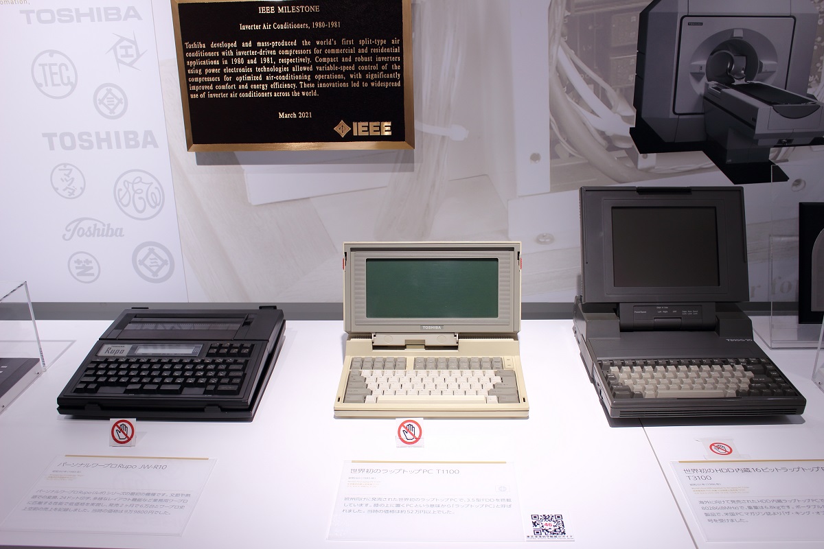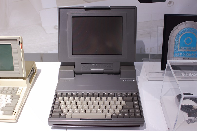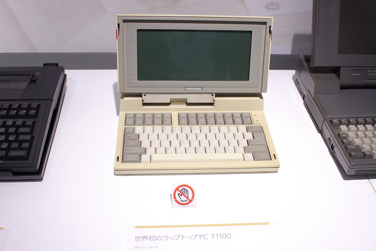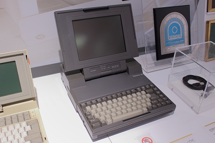 ラップトップPCが登場するまではPCはデスクトップ型のみであり、PCの移動は困難で、ましてや気軽に持ち歩きなど出来るものではありませんでした。 (当時のデスクトップ型PCはディスプレイも重く大きいCRTディスプレイが主流でした。)しかしラップトップPCはそれまでには出来なかった容易な移動、持ち歩きを実現することになります。現在オフィスで主流のノートPCほど軽く小さくはなく、バッテリーも無かった為、真のポータブル機ではありませんでしたが、それでもラップトップPCの登場はそれまでのオフィス環境に大きな変化をもたらしました。そういった意味からも今回訪問した東芝未来科学館が所有するT3100は歴史的価値がとても高いものと言えるでしょう。