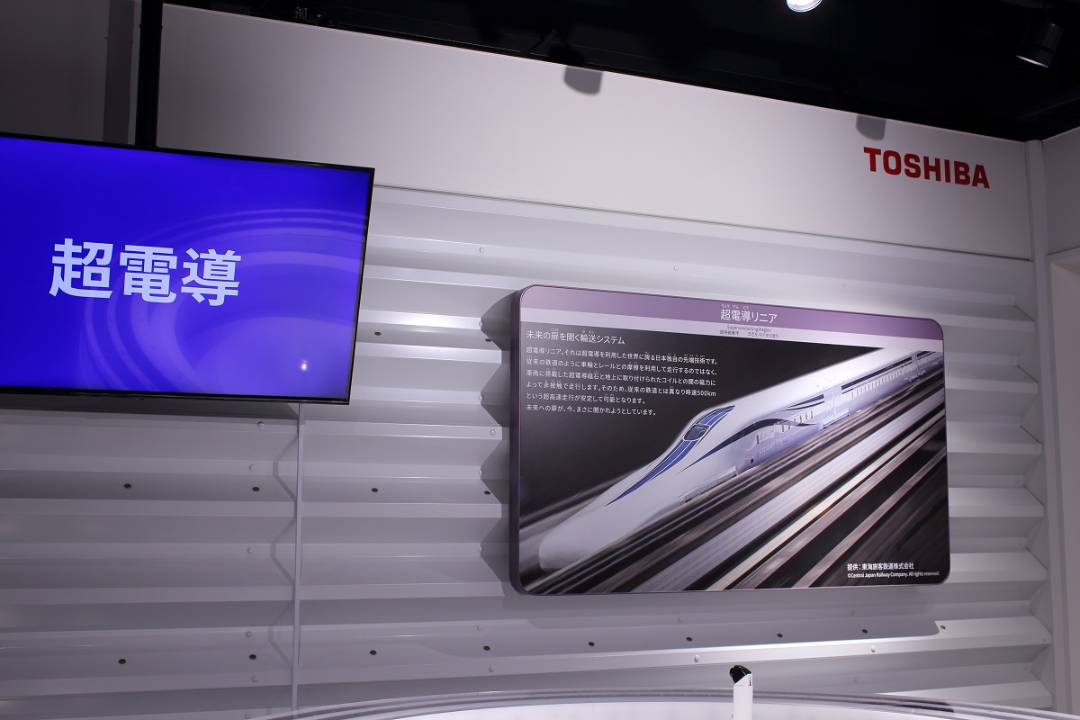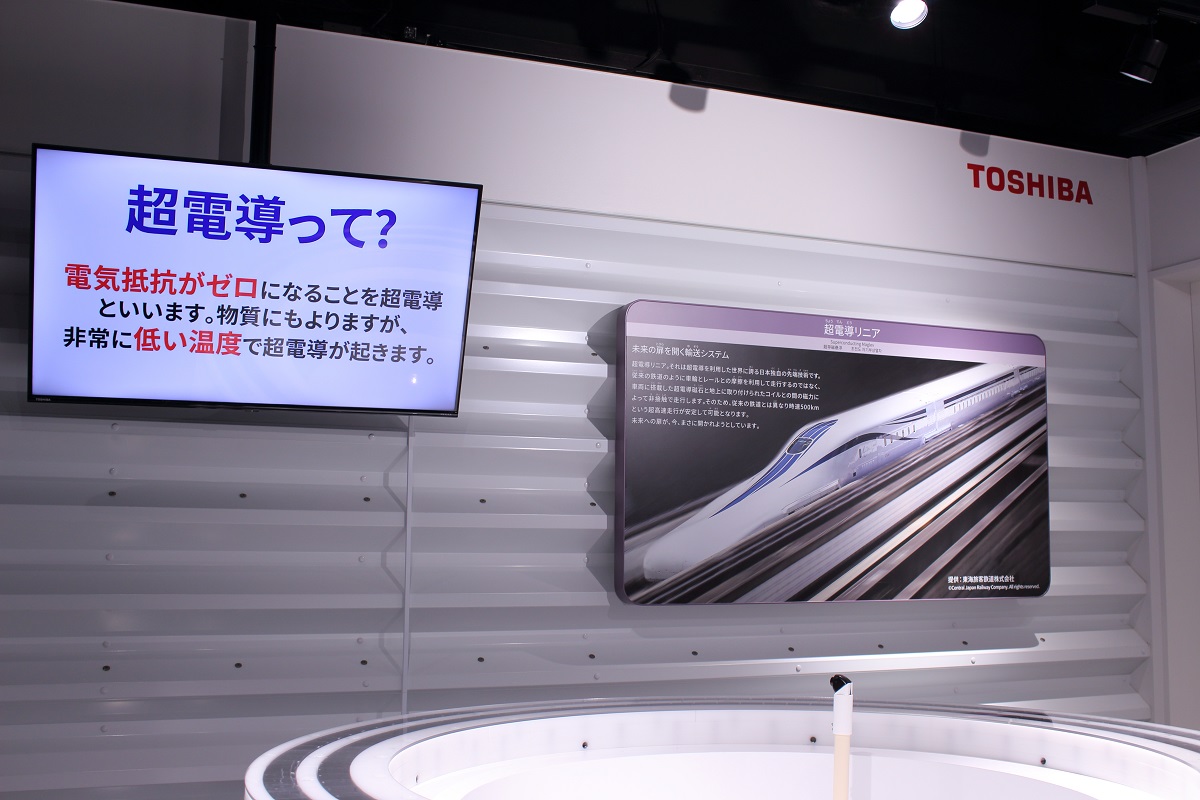 サイエンスゾーンでは「超電導」についての展示もありました。「超電導」に関する東芝の取り組みとして、超電導リニア、超電導送電、超電導蓄電装置、MRI(Magnetic Resonance Imaging)、重粒子線がん治療、核融合装置などがパネルで紹介されていました。中でも超電導現象を利用する「超電導リニア」(リニアモーターカー)については大きなパネルで、ひときわ目立つ展示になっていました。社会でも話題となることが多い日本の超電導リニアですが、その心臓部ともいえる超電導磁石は「東芝」が開発しているのです。