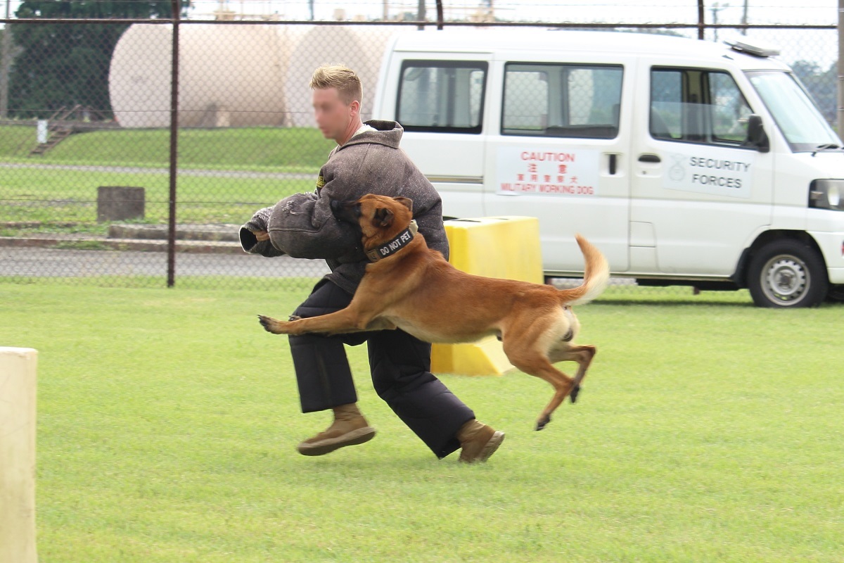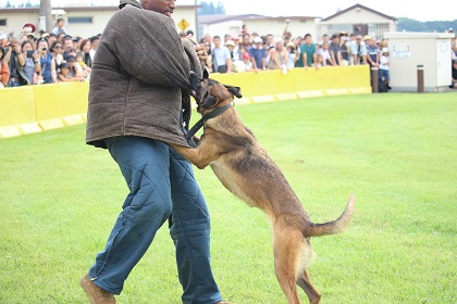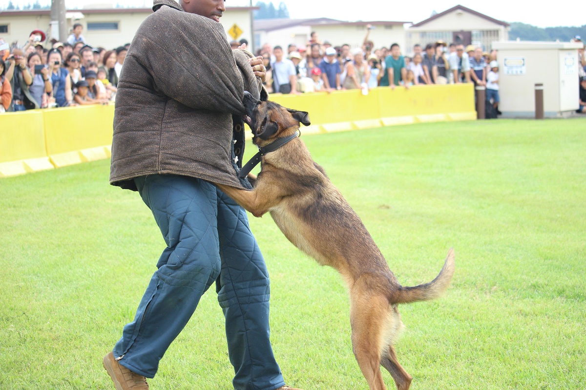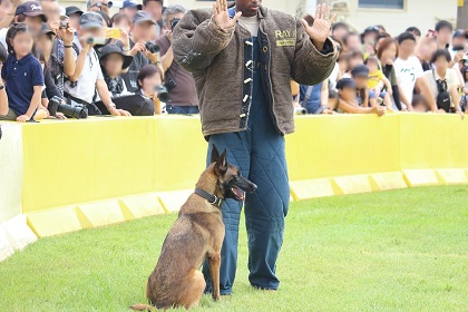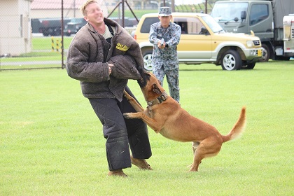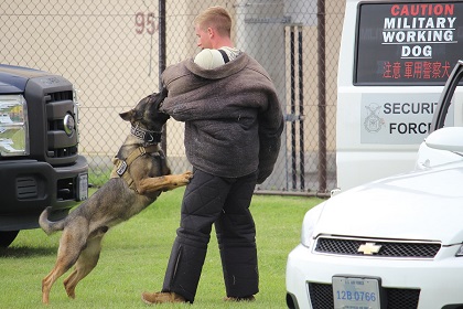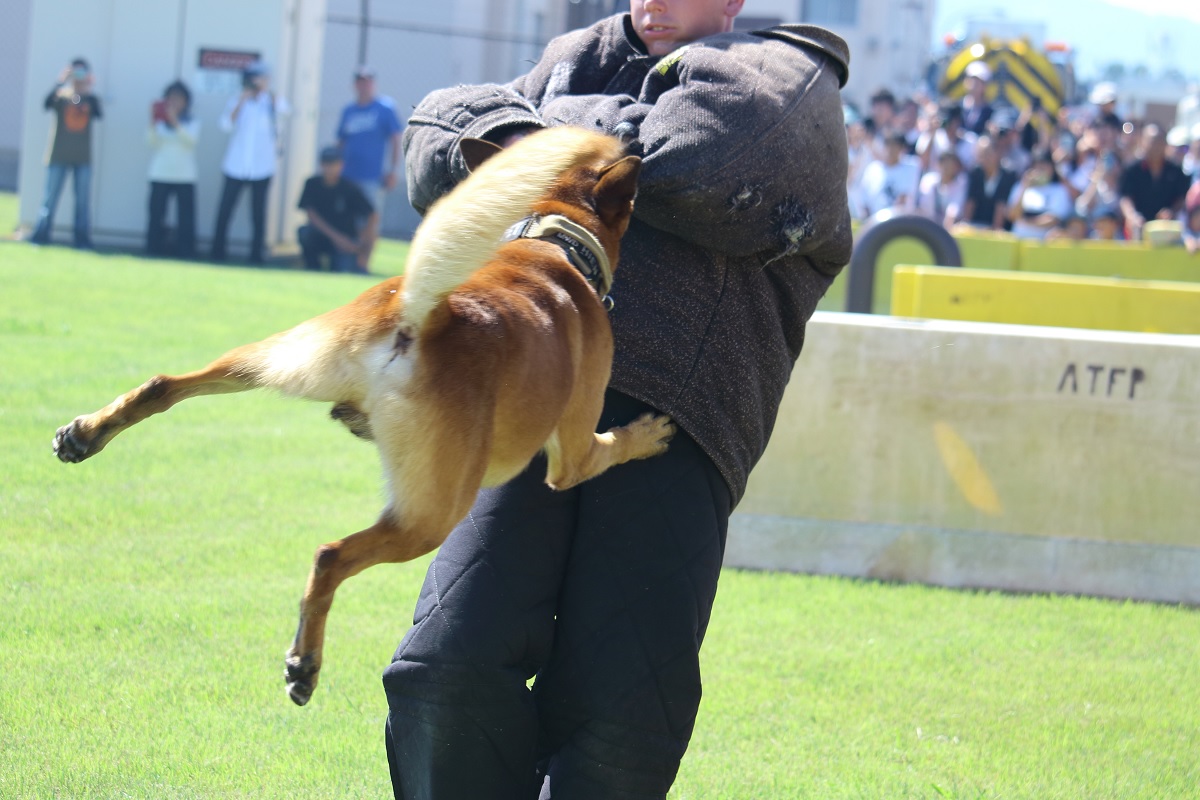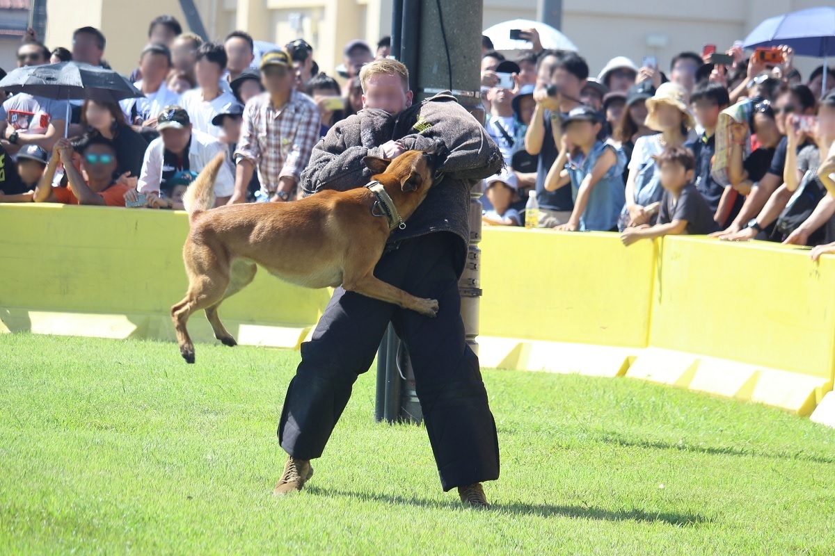 実演では軍用警察犬が訓練士(ハンドラー)から指示されると 敵となる攻撃対象の人間に襲い掛かります。そして訓練士の指示があるまで敵に噛みついて決して離れません。(実演のときは敵役の米兵の人は防弾チョッキのようなものを着て身を守っています。)この実演はかなりの迫力なので一見の価値はあると思います。