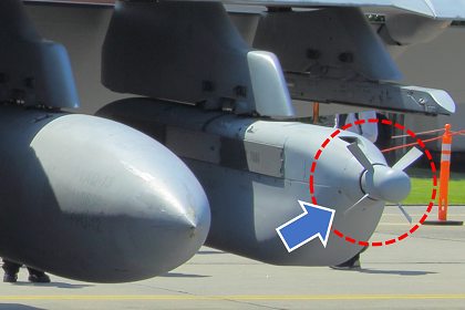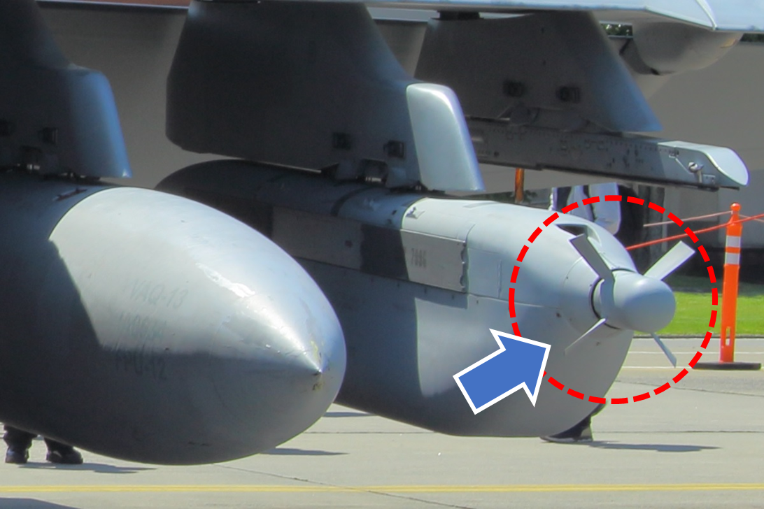 今回の日米友好祭で展示されていた「EA-18G」が懸吊する電波妨害装置のズームアップ写真です。同装置の先端に電力供給用のラムエア・タービン(RAT)が設置されています。 |