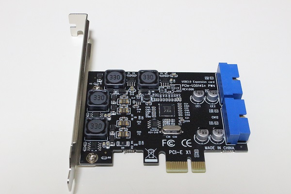 今回PCの前面3.5インチベイにメモリーカードリーダーとUSB3.0ポートを新たに装着するのですが、そのためにはPC内部にUSB3.0ピンヘッダーが2つ必要となります。しかし自分のPC内部の古いマザーボードにはUSB3.0ピンヘッダーは在りません。そこで、まずはUSB3.0ピンヘッダーをPC内部に増設するインターフェースボードを購入して用意しました。(下図)