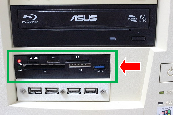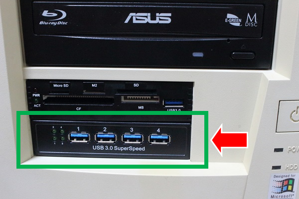 前述のメモリーカードリーダーの装着でPC前面にUSB3.0のポートをひとつ作ることができましたが、