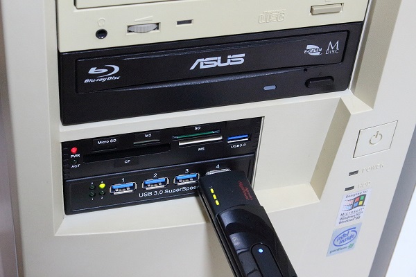 メモリーカードリーダーの装着ができたので、動作の確認を行います。今回装着したメモリーカードリーダーは様々なメモリーカードの読み書きが可能ですが、対応カードの全種類はとても所有していないので、SDカードとUSBメモリーで動作(認識・読み書き)を確認しました。