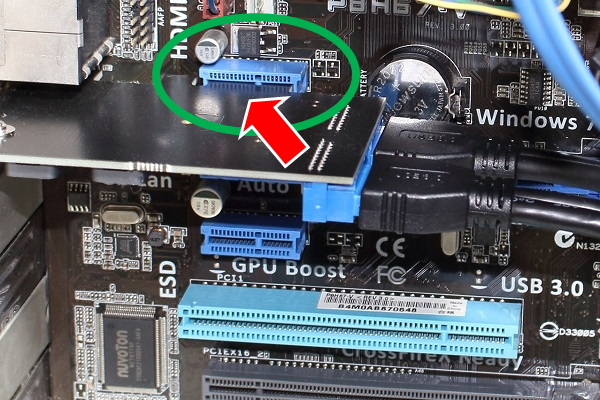 このインターフェースボードは中国のSSUというメーカーの製品で、マザーボードとのインターフェースは PCI Express ×1、PC内部にUSB3.0ピンヘッダーを2つ増設することが出来ます。これは今回のPC機能向上を実現するための鍵となる重要なパーツになります。自分のPCのマザーボードのPCI Express ×1スロットは未使用の状態で空いていたので、ここに今回購入したこのインターフェースボードを接続します。(下図)