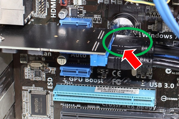 次にメモリーカードリーダーの接続ケーブルを、今回PC内部に増設したUSB3.0のインターフェースボードに下図のように接続します。(なお、下図の写真は全ての作業完了後の状態になっています。)これでメモリーカードリーダーの装着作業がすべて完了しました。