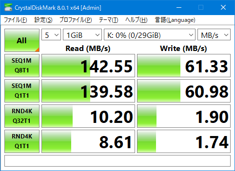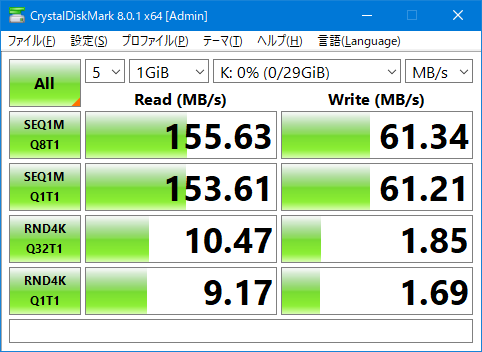 「CrystalDiskMark」による転送速度の測定結果(下図)を見ると、例えばシーケンシャルアクセスのリード(読み込み)において、USB2.0の理論値としての転送速度60MB/sを超える転送速度が確認できます。これによりメモリーカードリーダーのUSB3.0ポートがUSB3.0として正しく機能していることが見て取れます。