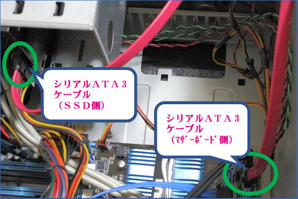 SSDにシリアルATA3対応のケーブルと電源ユニットのシリアルATAの電源ケーブルをつなげる。そしてSSDを装着した3.5インチベイの金具をPCケースの3.5インチベイにセットする。(3.5インチベイの金具をPCケースの3.5インチベイにセットしてからケーブルをつなげても構いません。)