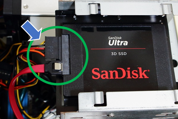 SSDとマザーボードをシリアルATA3に対応したケーブルで接続する。