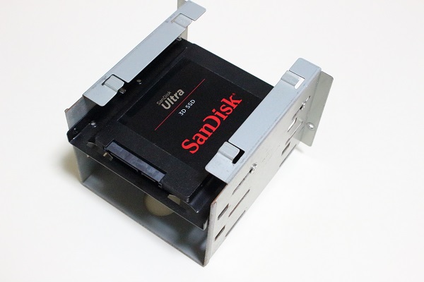 2.5インチSSDに、変換マウンタを付けて3.5インチのサイズに変換する。