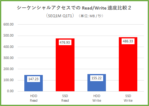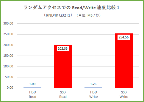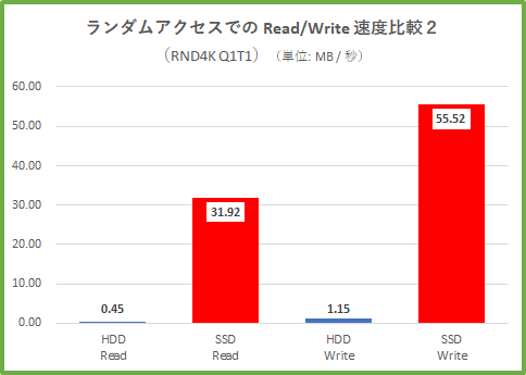 というよりランダムアクセスにおいては、HDDよりSSDのほうが桁違いに速くなっています。
