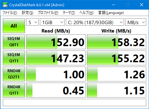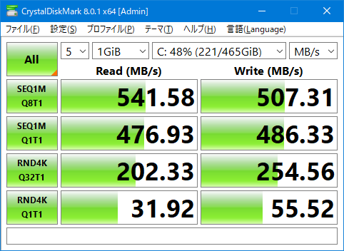 まず、以前よりどれだけストレージの転送速度が向上したかをフリーソフトの「CrystalDiskMark」を使って計測しました。