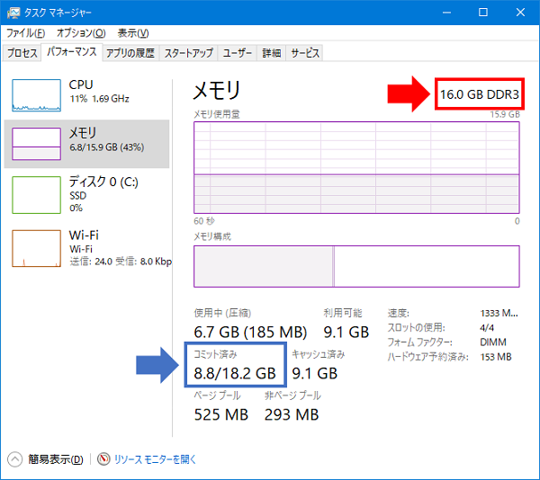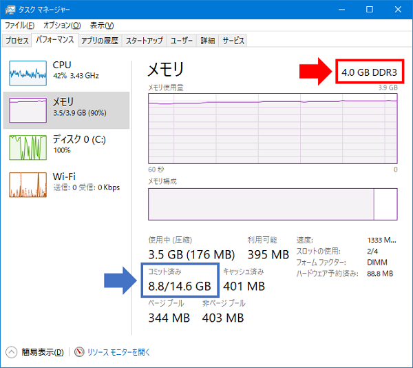 この図の赤い矢印のところを見ると現在のPC(自作のデスクトップPC)のメインメモリの容量は4GBであることが分かります。また実際使っているメモリ容量は図の青い矢印の「コミット済み」の左側の数値の箇所を見るのですが、よく使うアプリを複数起動した状態では現状、約8.8GBであることも上図から見てとれます。(ちなみに「コミット済み」の右側の数値は、物理メモリ+仮想メモリの合計値です。)