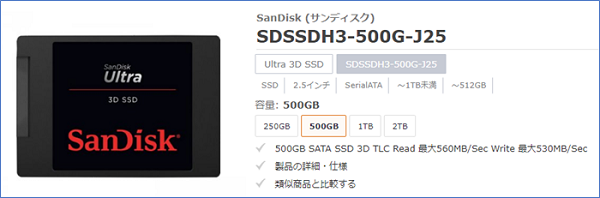 ストレージ高速化のため、今回は、SanDiskのSSDを購入しました。(下図)記憶容量は500GB、転送速度はシーケンシャルアクセスで読み込みが最大560MB/秒、書き込みが最大530MB/秒です