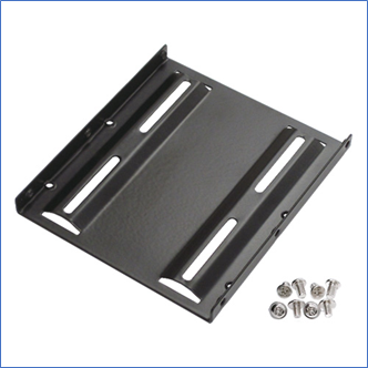 PCケースから3.5インチベイの金具を取り出し、変換マウンタを付けたSSDを3.5インチベイの金具に装着する。